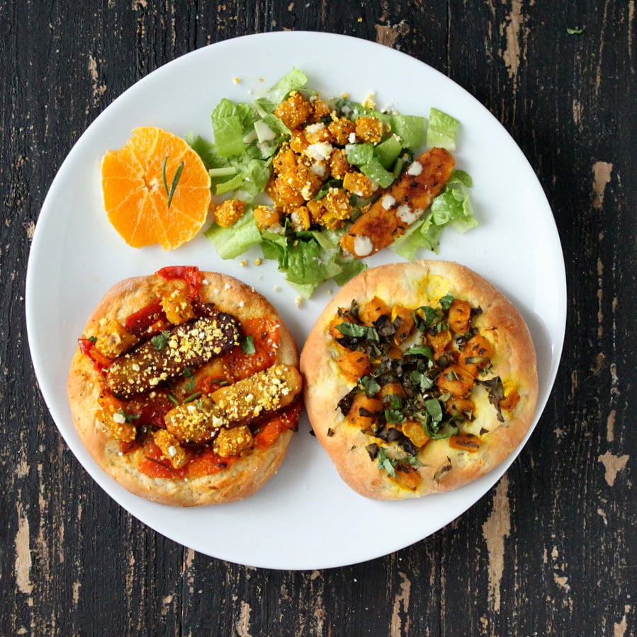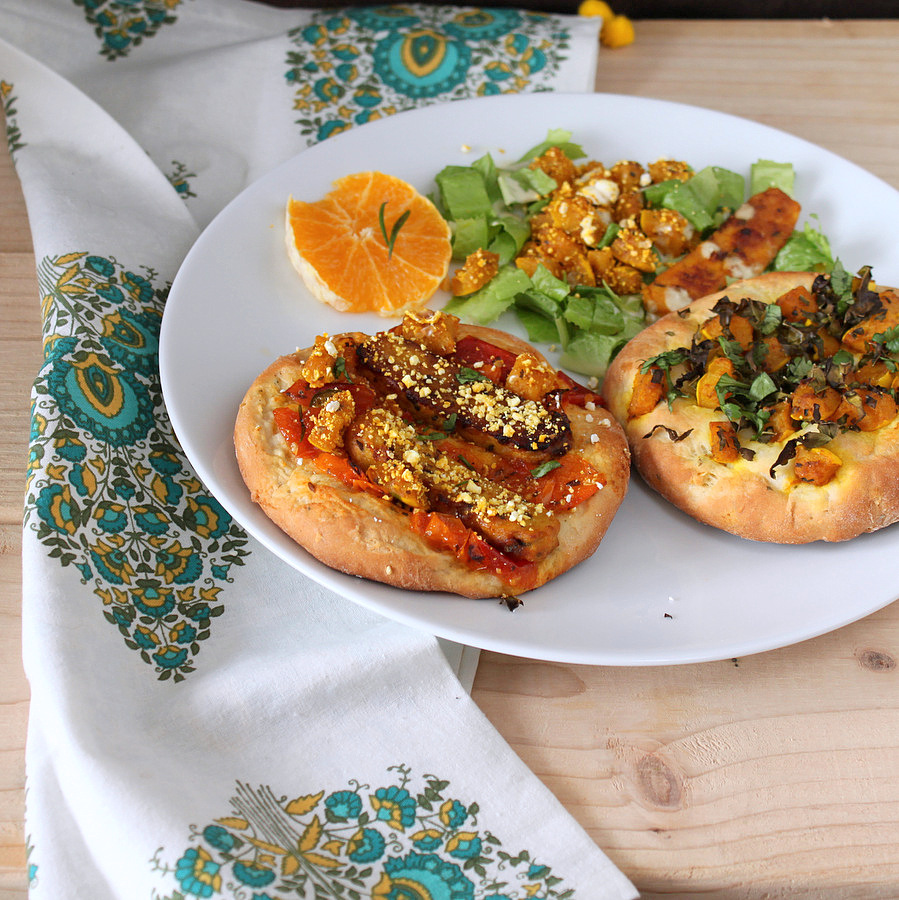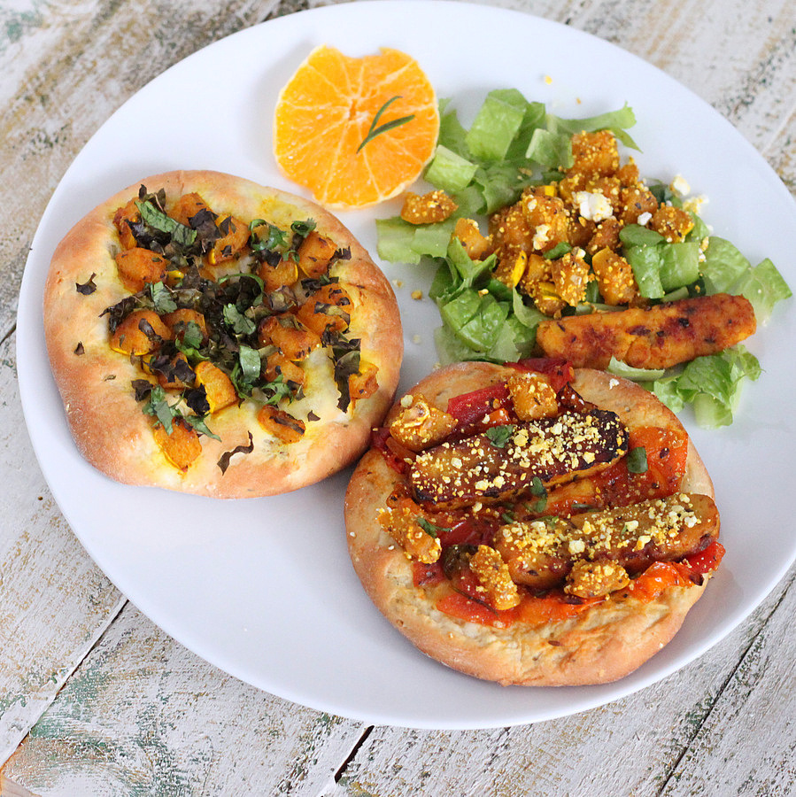 Fresh baked soft bread(seriously, who doesnt like fresh baked bread), one topped with Popcorn encrusted blackened Tempeh and Apricot and Tomato chutney sauce, the other topped with Butternut squash roasted with rosemary and chopped Kale. Served with a small side salad of lettuce, popcorn encrusted squash and a ranch cream dressing. Serve with coffee or orange juice. mmm