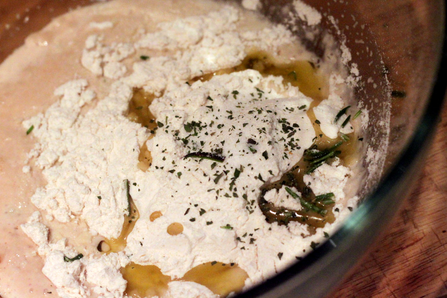 Add the flour, salt, rosemary and pepper. Mix well for a minute and let sit for 1.5 hours.