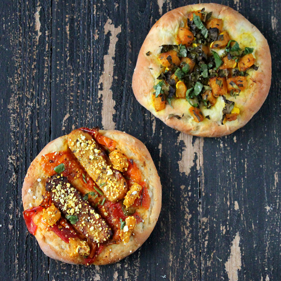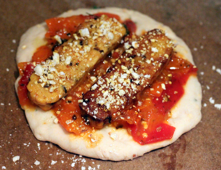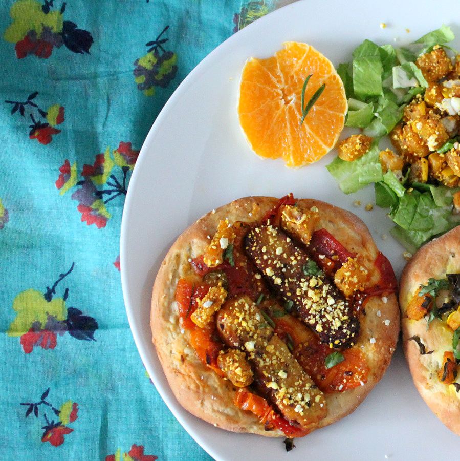 I loaded one rosemary and popcorn Pizza bread with the Apricot Tomato chutney, thenย popcorn encrusted Tempeh and rosemary scented and popcorn encrusted squash. (all ingredients in this one)