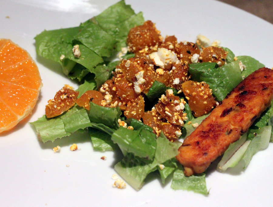 Baked and served with a Side salad of lettuce topped with popcorn encrusted Butternut squash and a drizzle of 2 teaspoons of ranch cashew cream dressing(raw cashew flour blended with coconut milk, salt, dill, vinegar and garlic powder), and a Slice of ripe Orange.