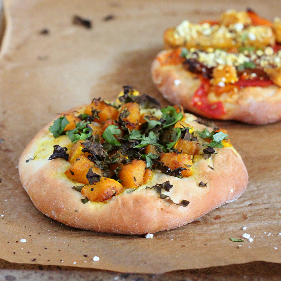 Popcorn encrusted Butternut Squash, Kale, Tempeh, Apricot and Tomato Chutney on Rosemary and Popcorn Individual Pizzas. Chopped Brunch challenge.