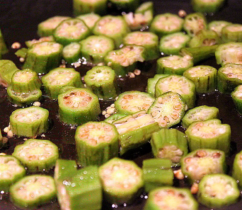 - Drop in the cut okra. The pan should be big enough to accommodate the cut okra without much overlap.