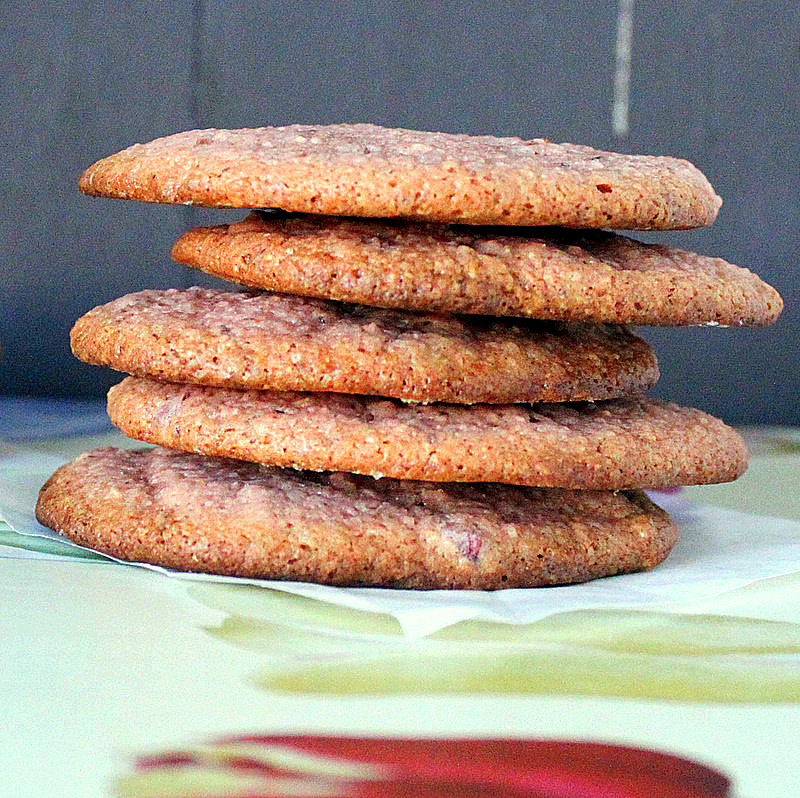 Crystallized Beet Multigrain Thins. Delicious, pink vegan cookies made with beet syrup and crystallized beet chunks, so delicious! Vegan Recipe. Jump to Recipe