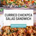 This curried chickpea salad sandwich is truly easy to make ! It takes just 10 minutes to whip up the chickpea salad mixture and you can make it ahead of time and just throw it onto a sandwich the next day. The only cutting involved is chopping and thinly slicing some onions.
