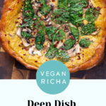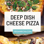 This Vegan Deep Dish Pizza with Pretzel Crust, homemade vegan cheese sauce, mushrooms and spinach is perfectly saucy, melty, gooey and really easy to make from scratch! And the pretzel crust takes it to another level! Soyfree Nutfree option