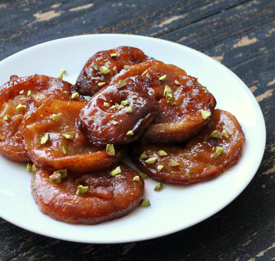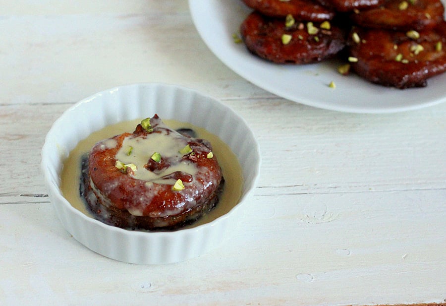 Apple Jalebis with Rabri – Apple fritters soaked in Saffron flavored syrup, served with cardamom flavored cashew cream.