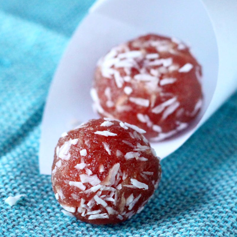 Pictured above- Coconut Laddoo. Pink coconut balls made with fresh shredded coconut and colored with beet.