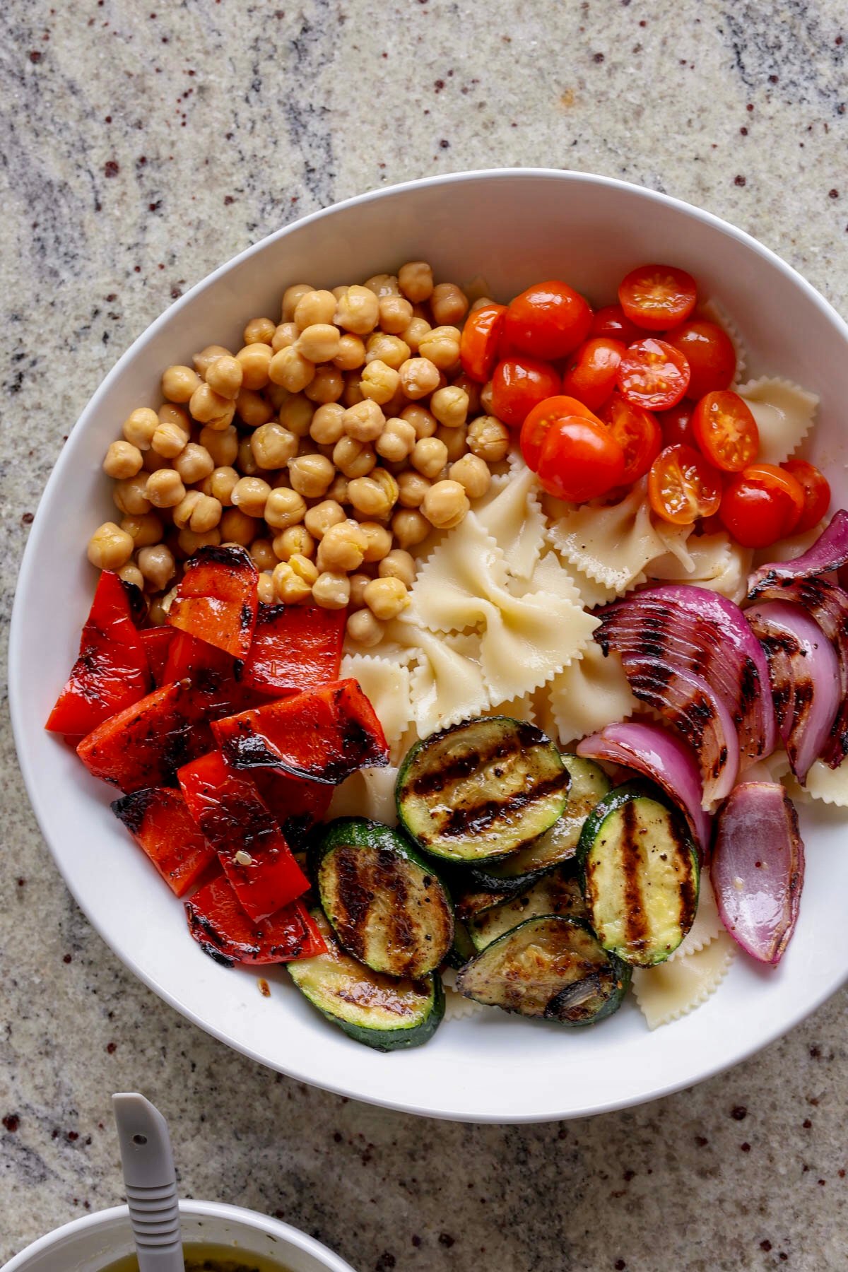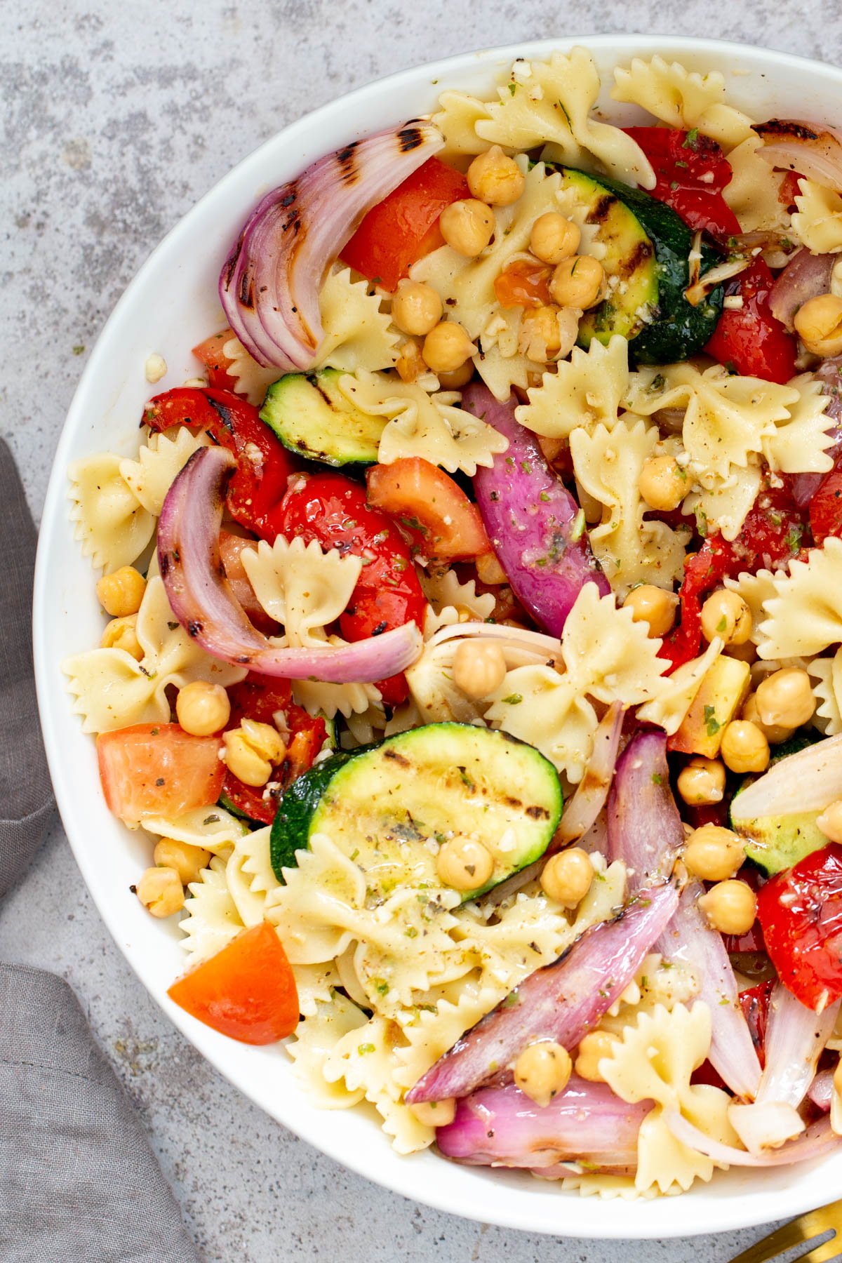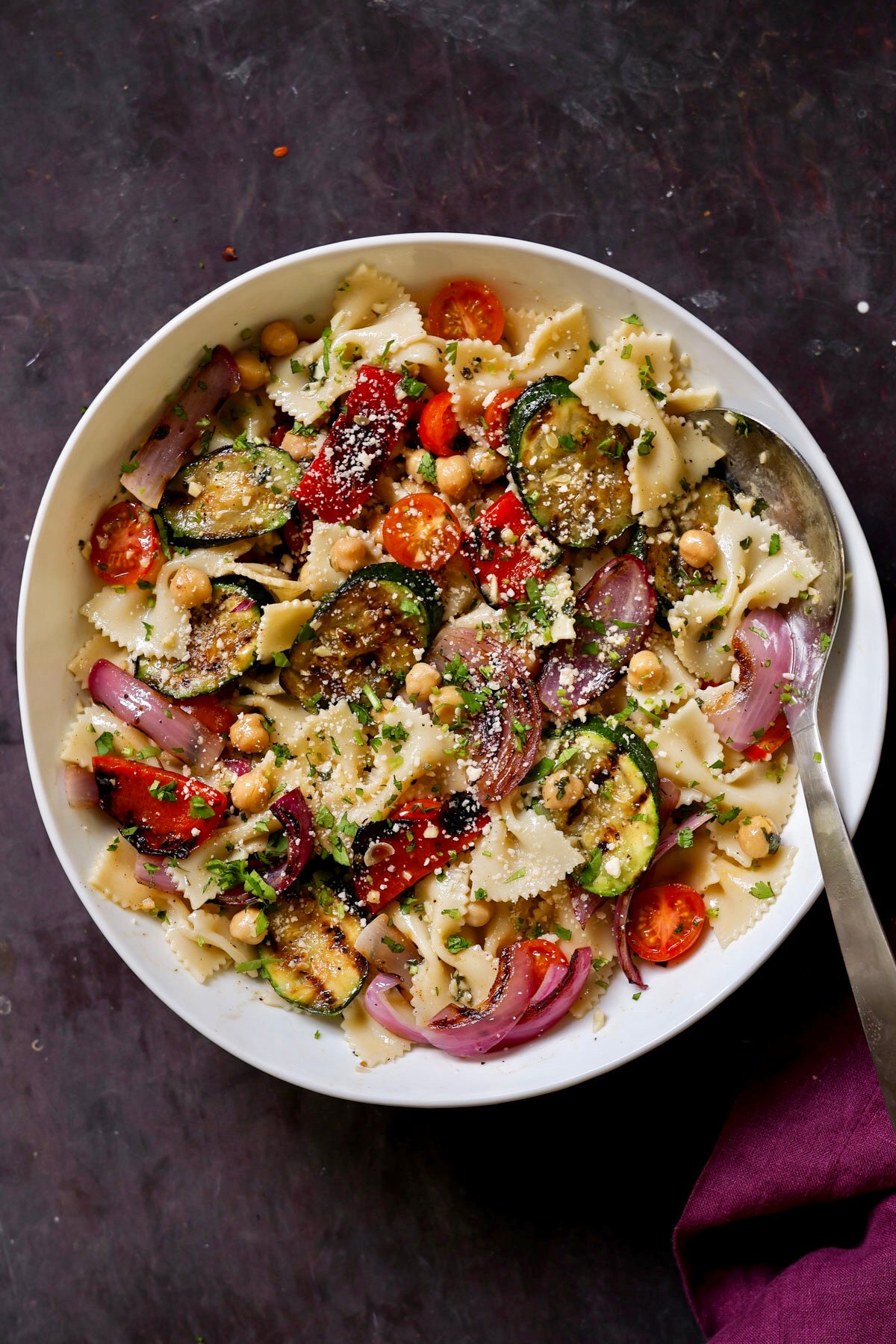 - Add all the salad ingredients to a large bowl — pasta, tomatoes, grilled zucchini, grilled bell peppers, grilled onions, chickpeas, basil — and toss well. Then add the dressing and toss again. Taste and adjust flavor and serve. Optionally top with vegan Parmesan and pepper flakes. This salad is also great chilled. Make sure to store in a closed container in the fridge, so that the garlic smell doesn’t get out in the fridge .