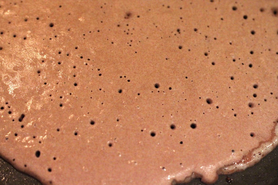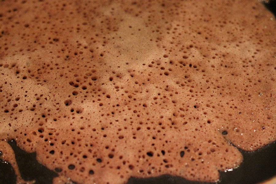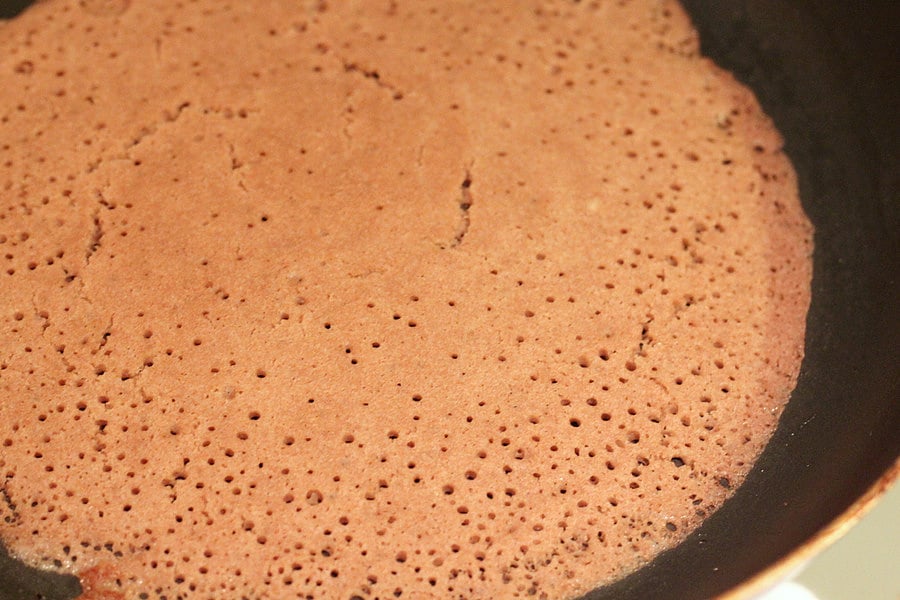 Once spread, wait for a few bubbles to appear then cover the pan with a lid to steam the injera for a minute or so.