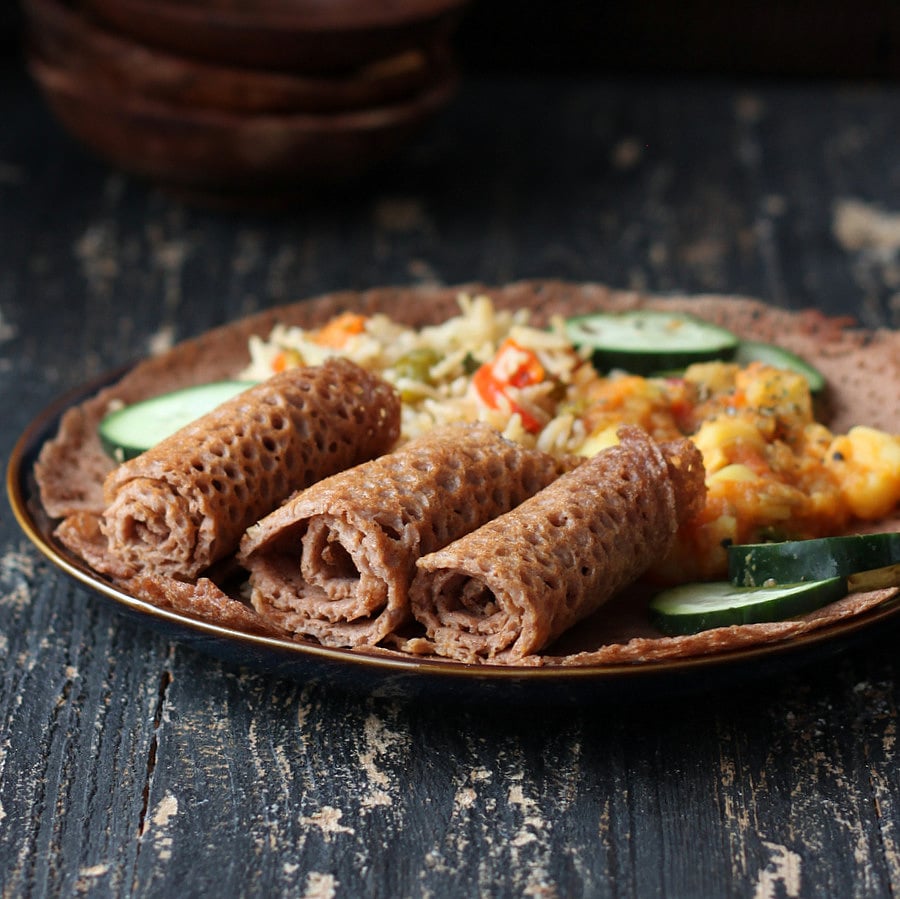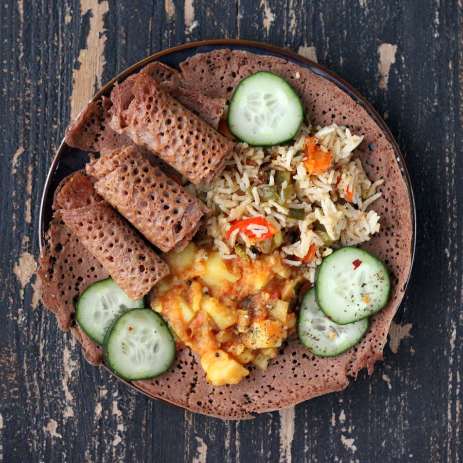 I loaded it with potato tomato curry and rice pilaf for the pictures. 😀 I did not have any Wats, so used whatever food I had in the pictures. Indian curries also go very well with the Injera, so its really a win win.