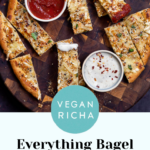 Learn how to make amazing vegan cheese breadsticks completely from scratch using homemade vegan pizza dough, vegan mozzarella sauce and sprinkle them with Everything Bagel seasoning and fresh garlic for the ultimate party snack. Gluten-free option included.