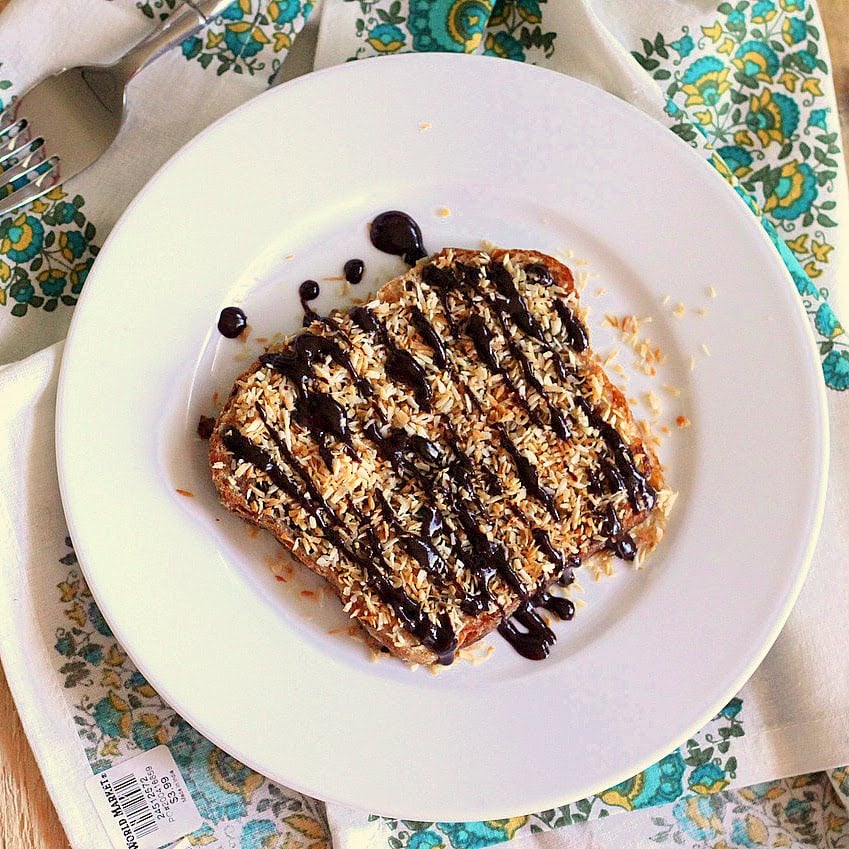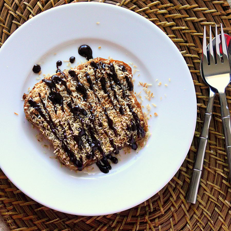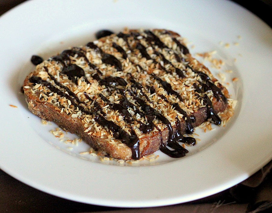 - Top the prepared French Toast with Date caramel as thick a layer as you want, then toasted coconut and then drizzle some melted chocolate. Done! Serve!