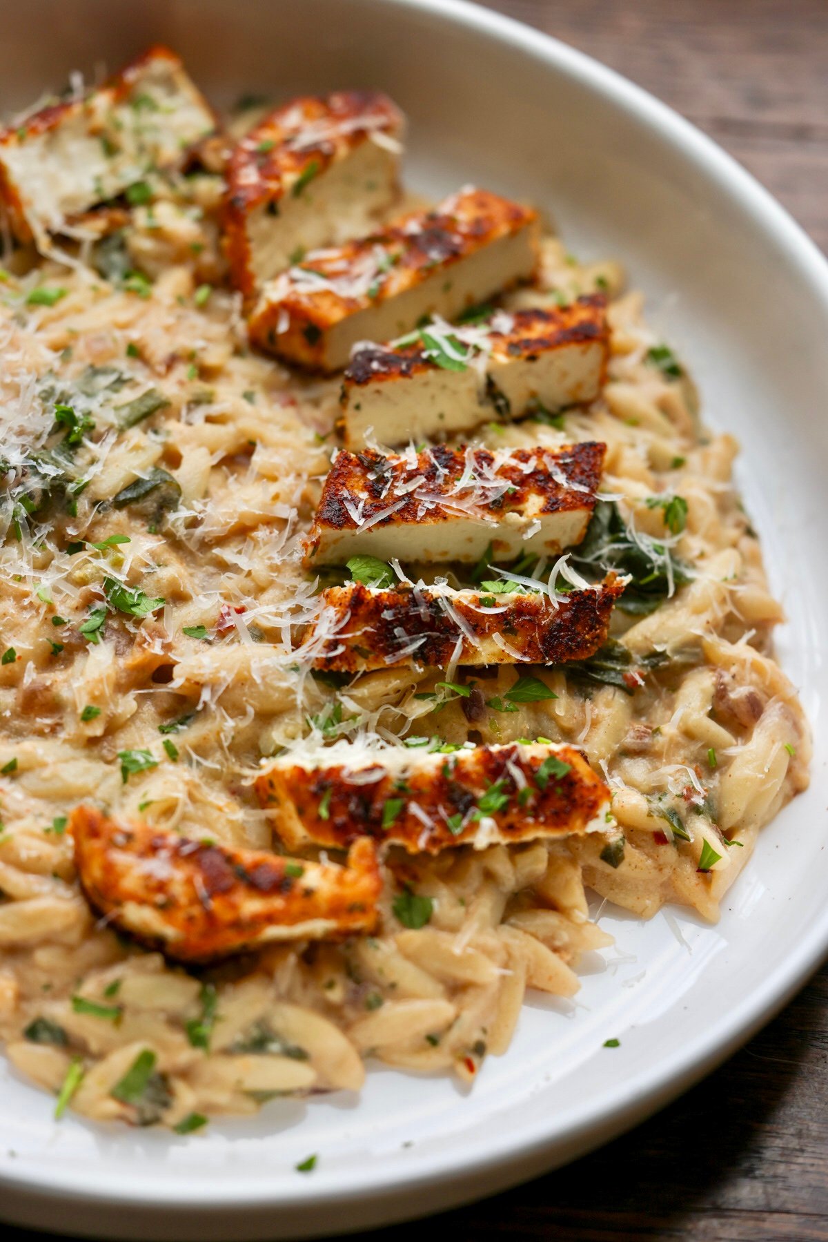 - Garnish with chopped herbs, like fresh parsley or basil and a good sprinkling of vegan parmesan. Slice the crispy tofu and add a helping of orzo to your serving plate. Place the tofu slices on top of the orzo, sprinkle with more parmesan and chili flakes, if desired, and serve.