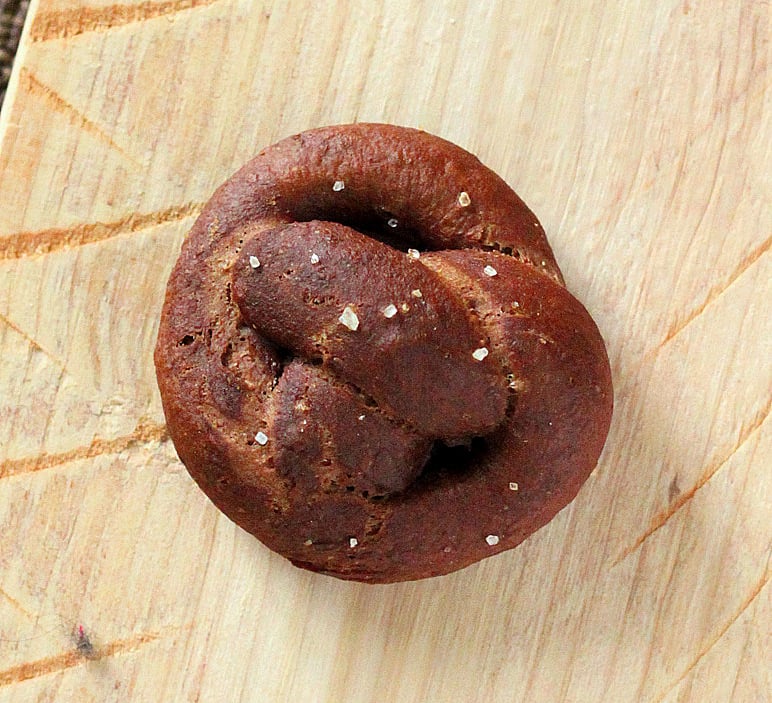 For regular wheat flour pretzels see Stuffed pretzels here. Add cocoa powder to get desired color and extra sugar. Rest of the steps like normal pretzels.