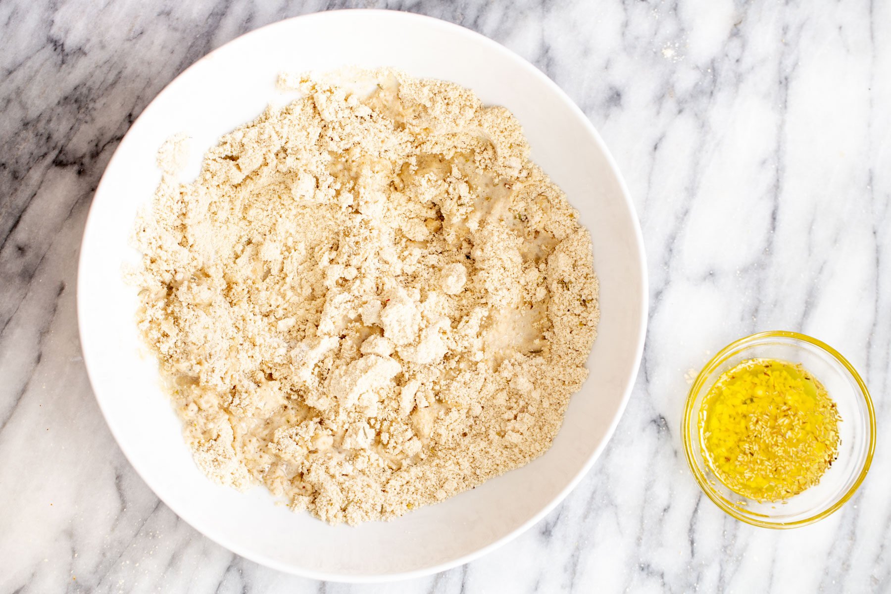 - Make the bread batter: To a bowl, add all the dry ingredients and mix well. That is the almond flour, oat flour, potato starch, salt, baking powder, herbs, and garlic powder, and mix really well. Press and mix to break the almond flour lumps. You can also add the ingredients through a sifter. This is especially helpful for gf baking