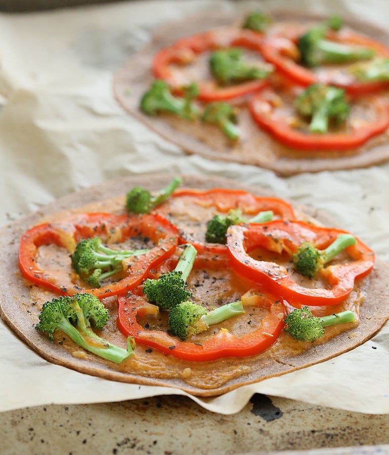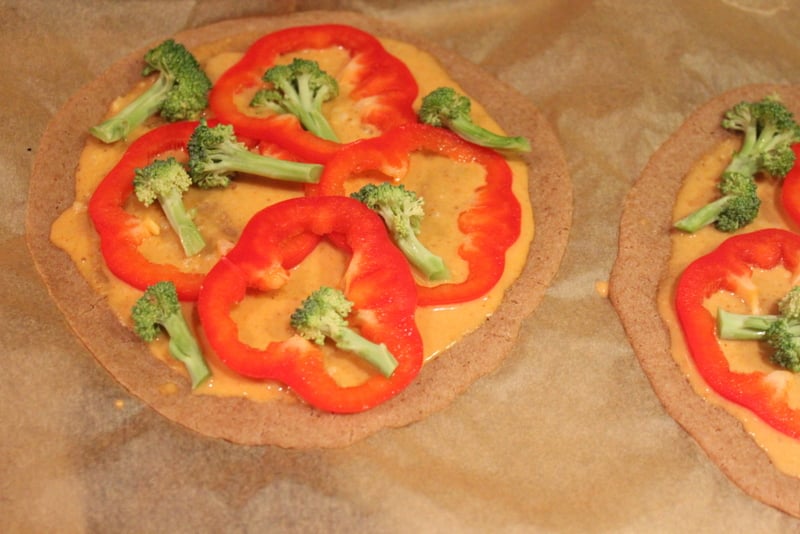 I topped it with Buffalo mayo because I am on an extra spicy and extra extra tangy kick lately and it works fabulously. You can use any regular pizza sauce, marinara, fresh pesto or even hummus.ย