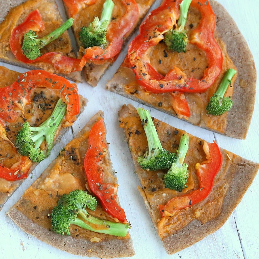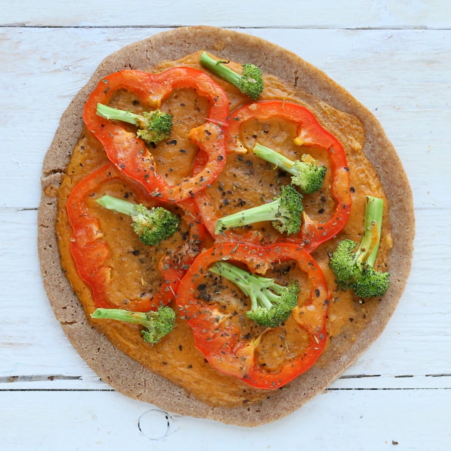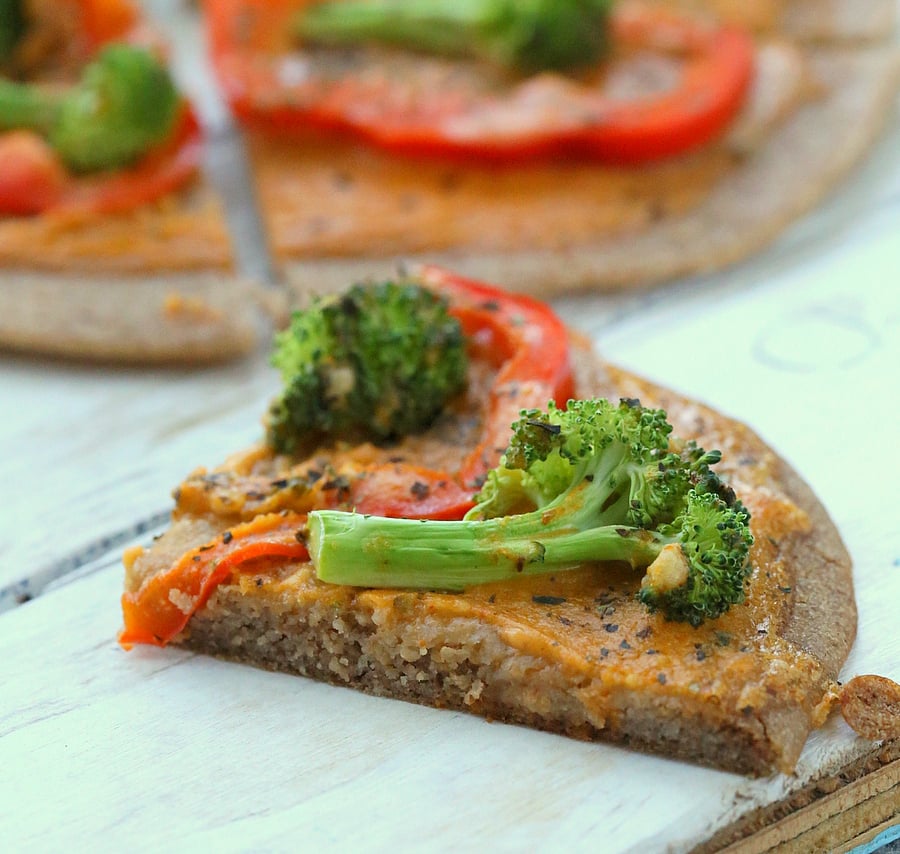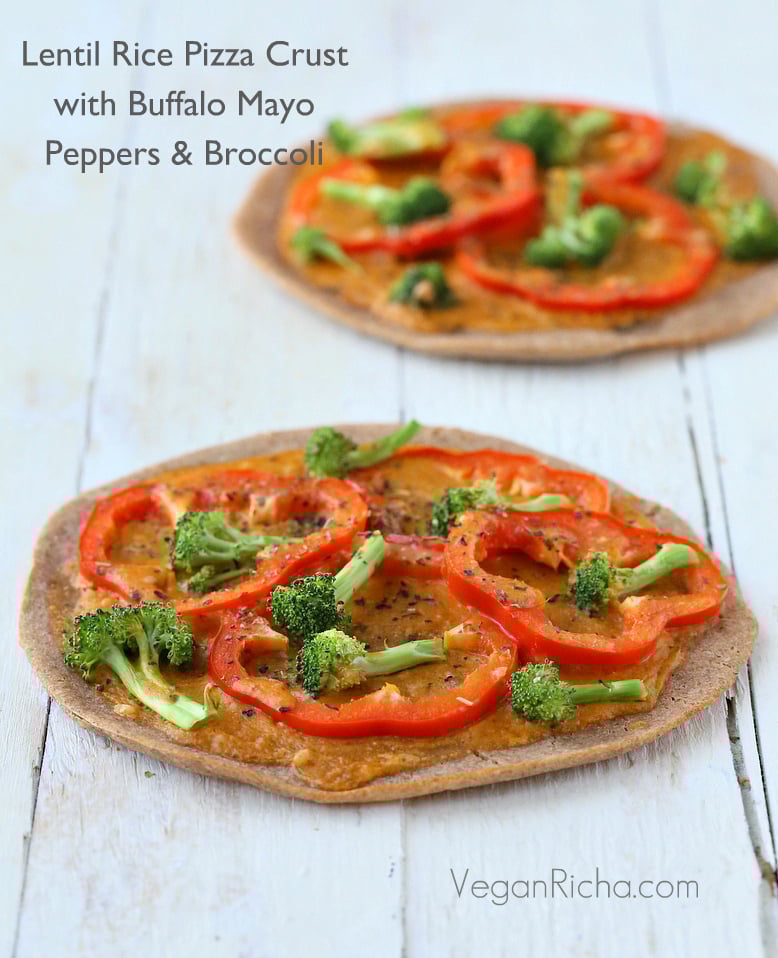 Lentil Rice Thin Crust Pizza with Buffalo Mayo sauce, Red Bell Peppers and Broccoli