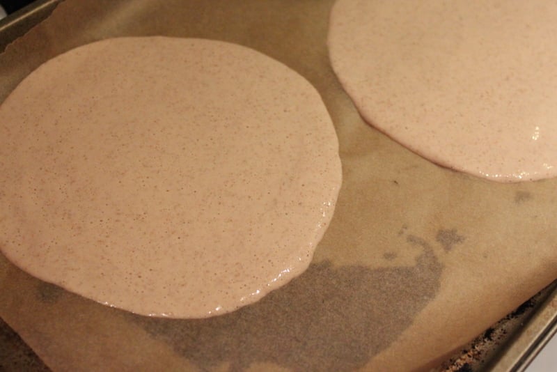 Pour 1-2 ladle full batter on parchment lined baking sheet.ย