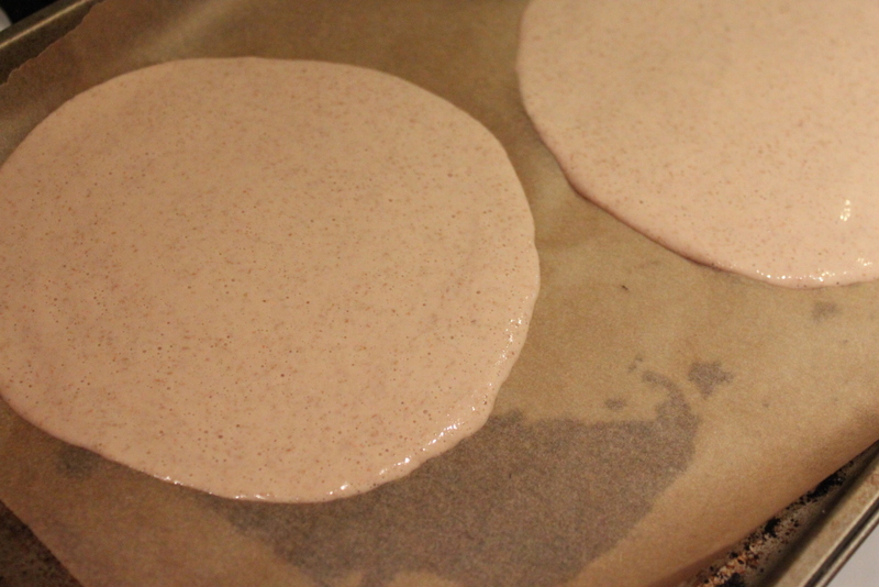 Pour 1-2 ladle full batter on parchment lined baking sheet.Â