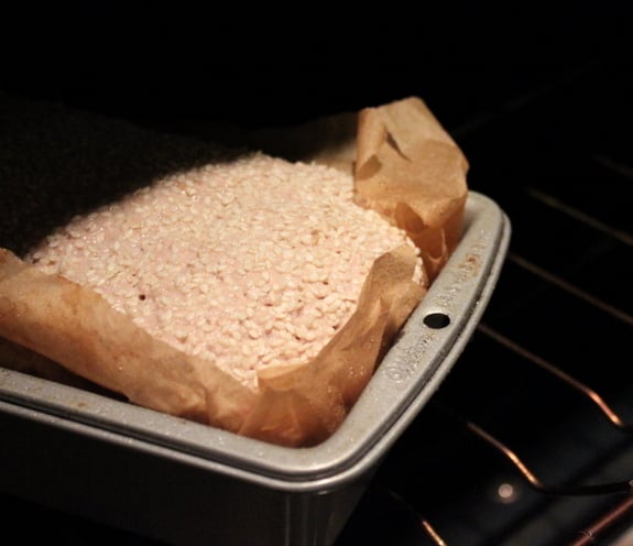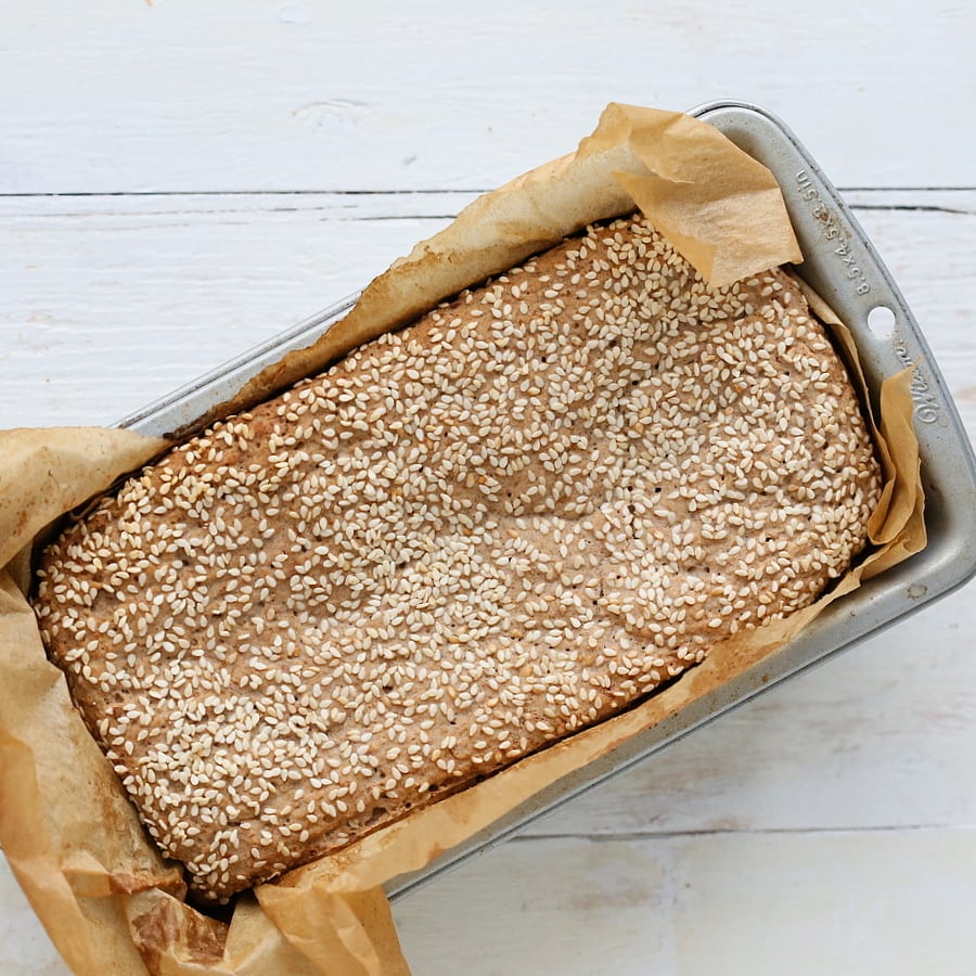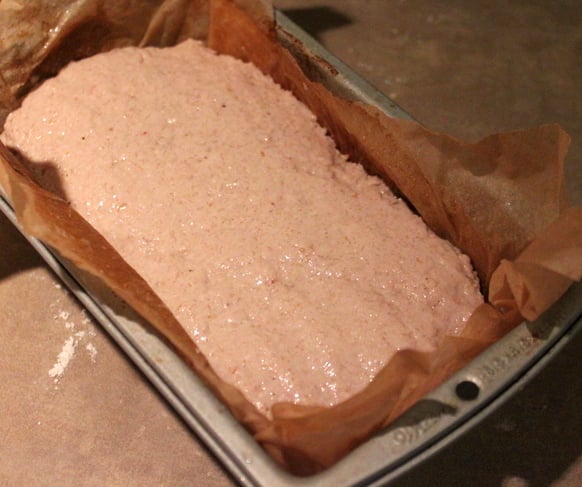 Drop batter onto parchment lined or greased bread pan. Spray water on top and lightly pat down to form a loaf.