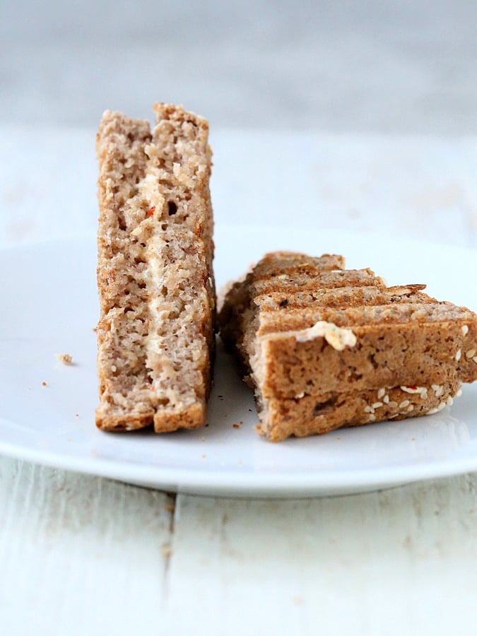 Or slice the bread once cooled after baking, and freeze the slices in a zip lock. Take the slices out, thaw for a few minutes, then refresh by toasting or grilling. The immediately frozen bread, performs almost like freshly baked bread. It gets all soft and moist when toasted. Slather some earth balance or nut butter.