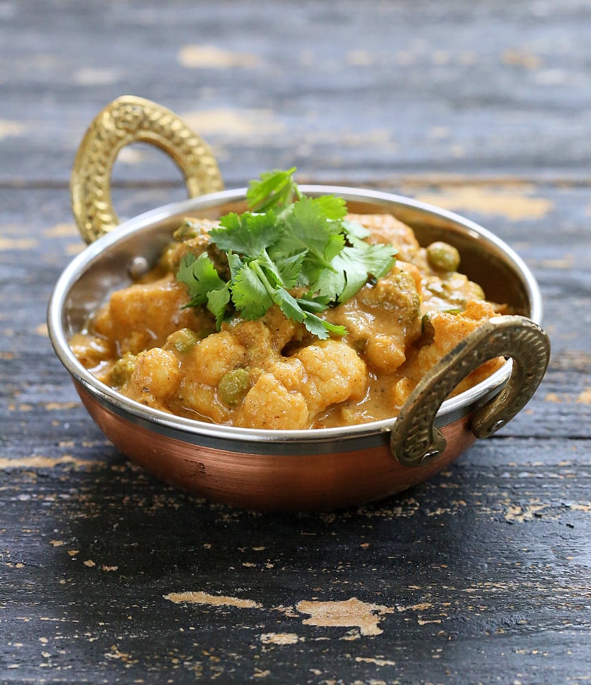 Blanch the cauliflower and broccoli florets. Make the gravy. Add the cauliflower, broccoli, peas and gravy to a pan. Simmer for a few minutes and done.ย