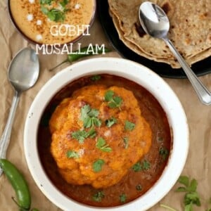 The whole head of the cauliflower is blanched, then roasted drenched in a creamy Mughlai gravy, and served whole with some gravy on the side. It seems like a long recipe but it is fairly simple:). You can serve it as is sliced, or with the usual Indian food fix-ins of flat bread or rice, or over other cooked grains and greens. We ate it with Chapatis, Naan, filled up some sandwiches with the leftovers, added some to quinoa. It was a load of food to finish between the 2 of us.