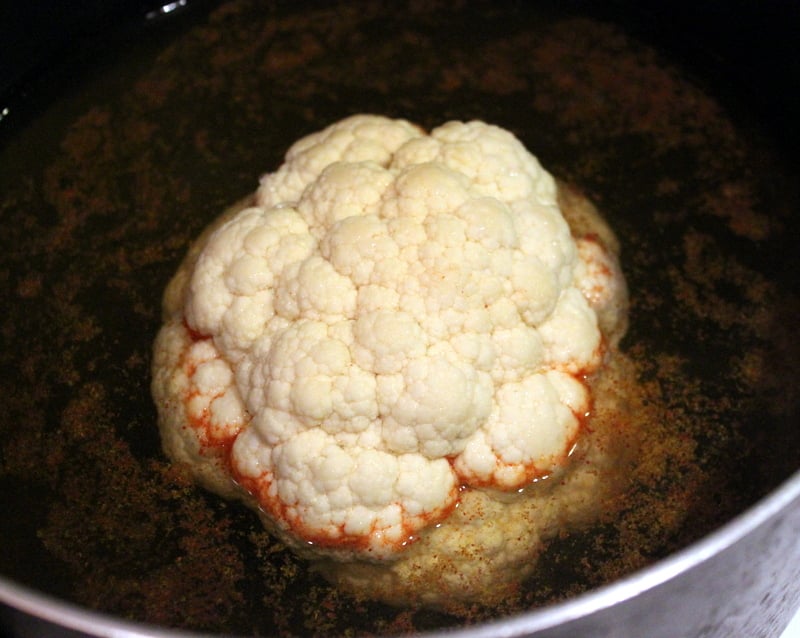 - Add salt, turmeric and chili and blanch/cook the whole cauliflower.