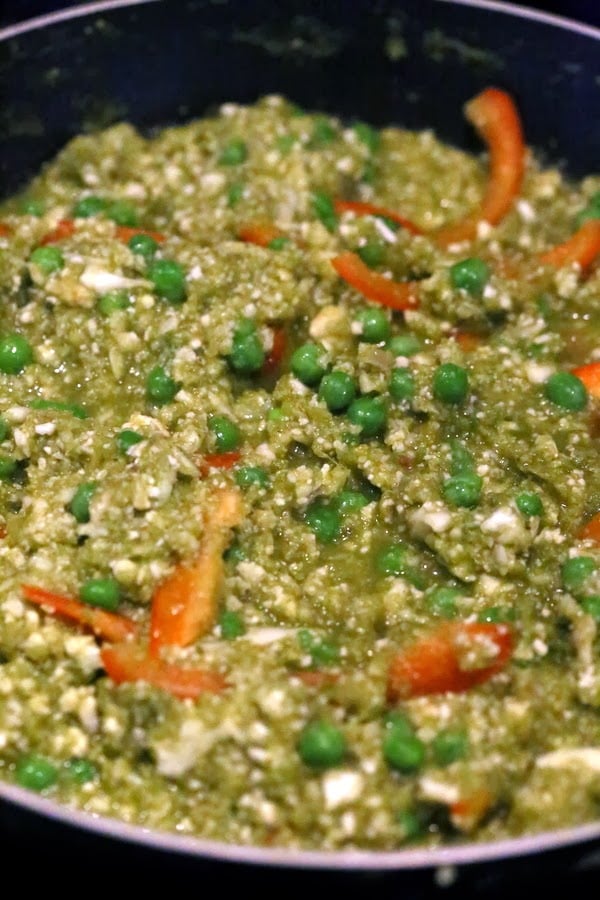 - Add the grated cauliflower and red bell pepper to the dry onion cilantro curry. Mix well to evenly distribute and cook for 2 minutes on medium heat. Add peas and a 1/2 cup of water(add almond milk for creamier version), lemon juice and salt. Cover and cook for 6-8 minutes. Mix and adjust salt and spice/cayenne. Cook uncovered to dry the curry a bit to preference or until the cauliflower is tender to preference. 3-5 minutes. Serve hot with Naan/flatbread or rice or grains or fill up tacos or lettuce leaves.