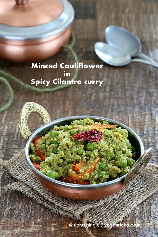 Cauliflower comes to the rescue again today. Grated up and added to the delicious cilantro based curry. If you are not a big fan of cilantro, you can substitute a good portion of it with any greens of choice like spinach. Crumbled up Tempeh would work beautifully in this curry too, especially to give the dish a more toothy and textured result.