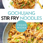 For an easy weeknight dinner, look no further than this easy gochujang noodles stir-fry. Rice Noodles are tossed with sauteed veggies and a sweet and spicy gochujang sauce. A vegan Korean noodles stir-fry that is quick and easy to make. Gluten-free.