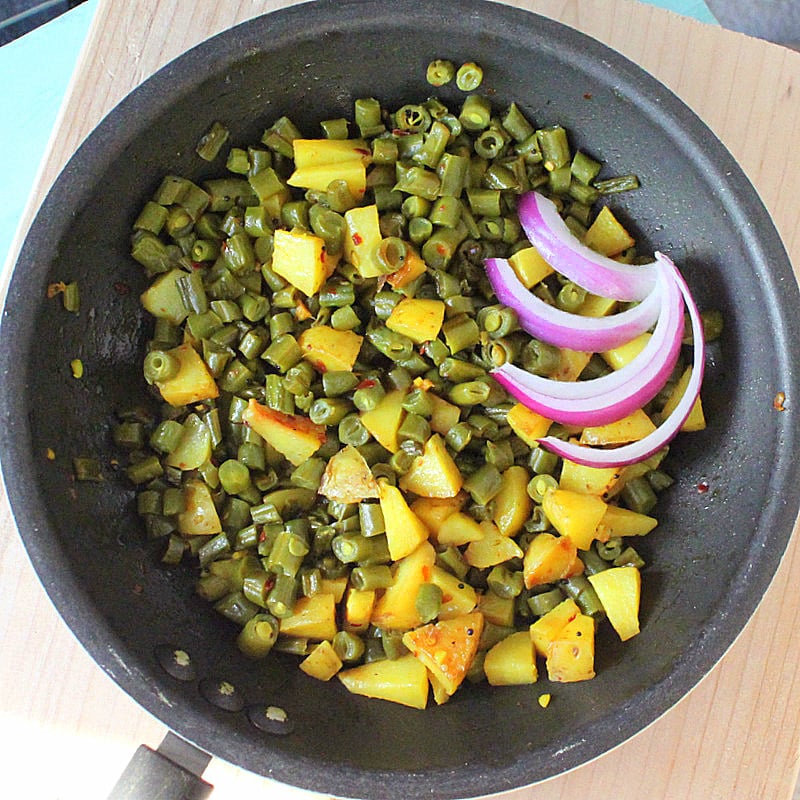 Add in about 2 cups of chopped green beans, mix, cover and cook on low heat for 10 minutes.