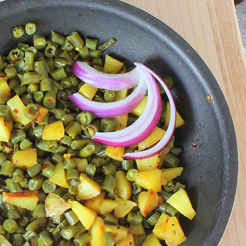 Have you seen my green beans and potatoes.. the beans get cut in random sized parts. same thing happens to potatoes and they get cooked on medium heat because I am usually in a hurry to eat.. and the beans get slightly golden or brown because of the high heat cooking.. no such thing in momโs version. all evenly cut and evenly cooked on a low simmer with occasional stirring and taken off heat on time. Serve these beans with your favorite Daal(Indian lentil soup), some flat bread and pickle!