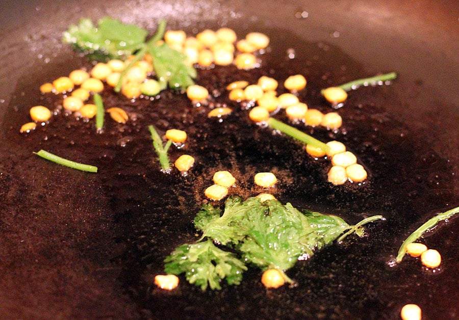 Add the asafoetida, split lentils/peas, 2-3 Tablespoons of cilantro and mix for a minute till the lentils just start to golden brown.