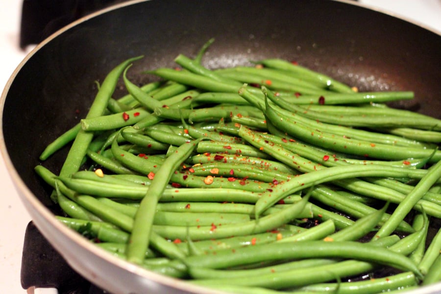 Add green beans, chili flakes, mix and cook.