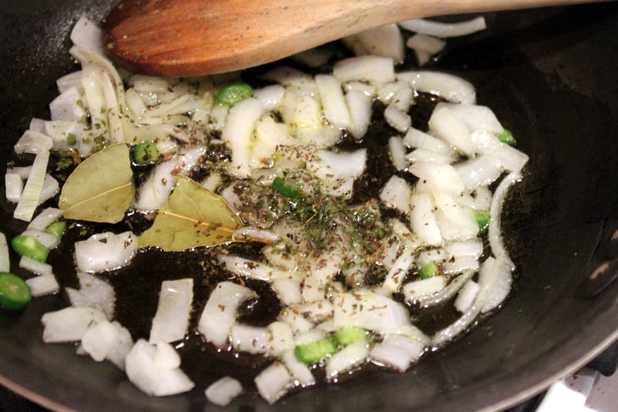 Add onions, dried herbs and bay leaf. Cook for 5-6 minutes until translucent.