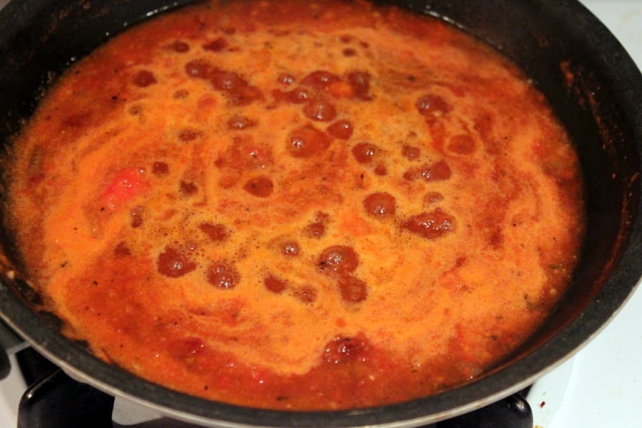 Add the puree to the onions, salt, herbs and cook on low-medium heat until the sauce thickens. 10-15 minutes