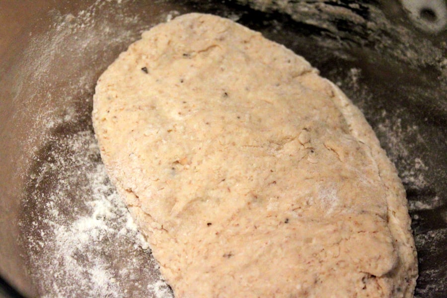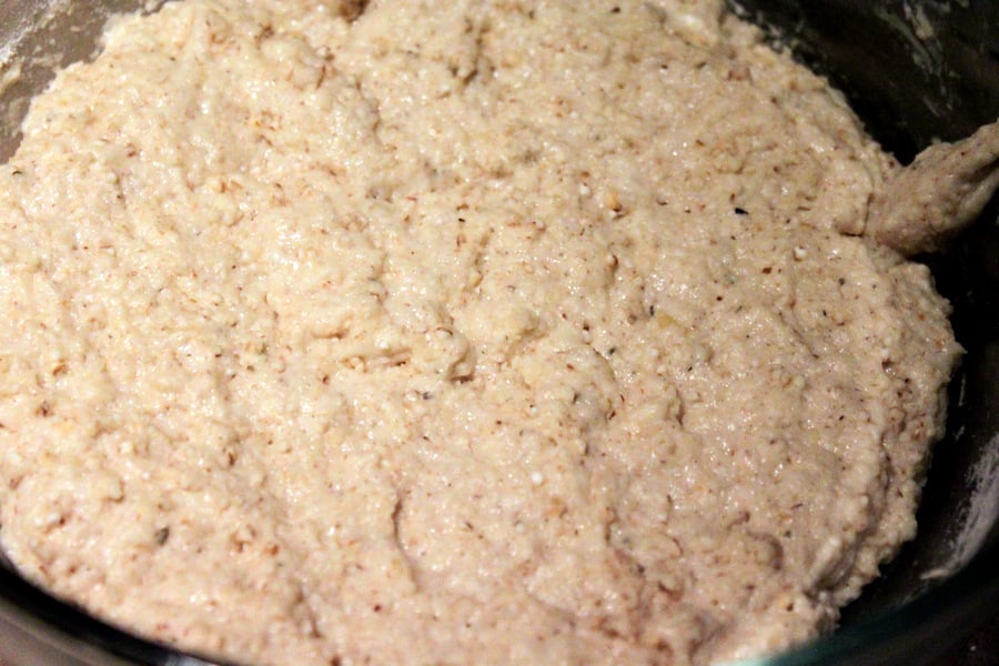 Add the flours, salt, evoo, herbs and mix well for 2 minutes.