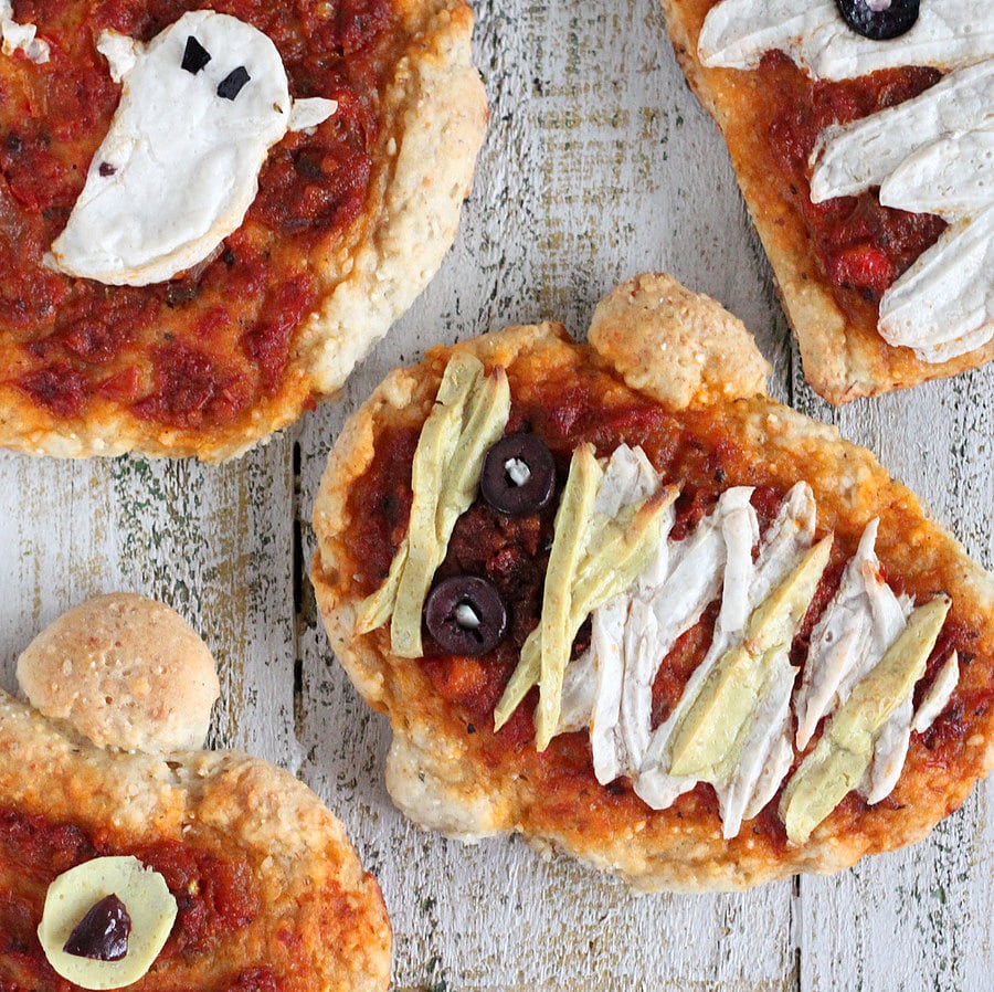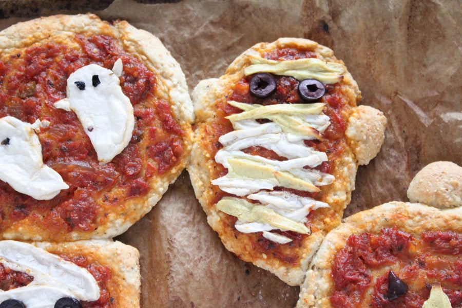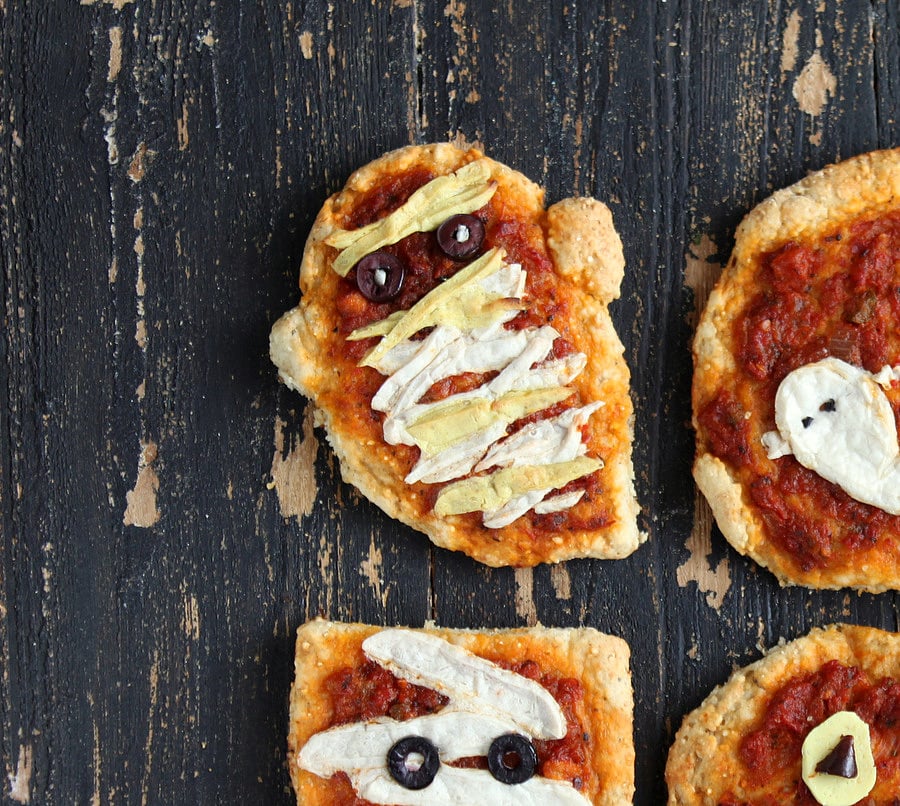 Mozzarella and Cheddar ghosts and Mummies with Sun-dried Tomato Marinara on Sesame Barley crust