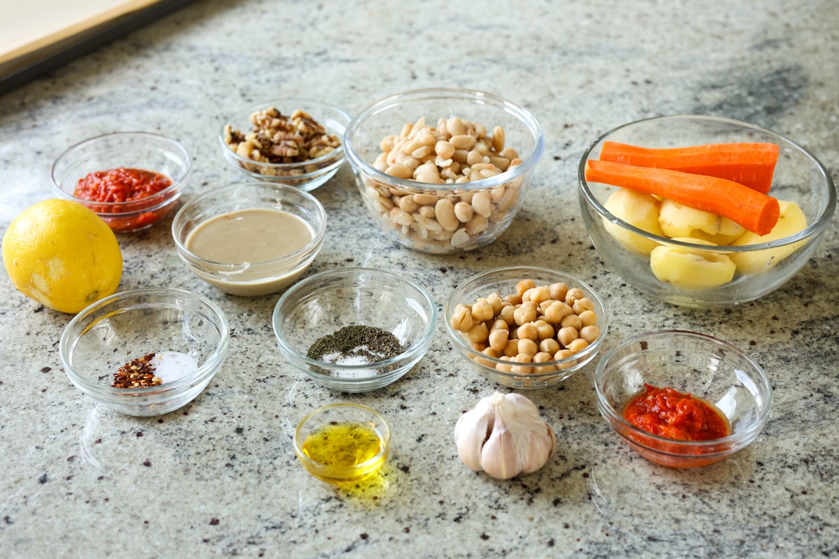 - Get the veggies, chickpeas, and garlic roasting in the oven while you make the walnut mixture and start the bean puree.