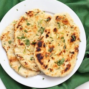 You can make this bread with yeast, use 1 tsp active yeast or use this yeasted Garlic Naan. It takes me the same time to put the dough together for with or without yeast, so personally I prefer the with yeast bread. To make this bread gluten-free, use the gluten-free blend used for gluten-free Naan in my book, or use a gluten-free blend with gum like Bob’s Red Mill Gluten Free 1-to-1 Baking Flour.