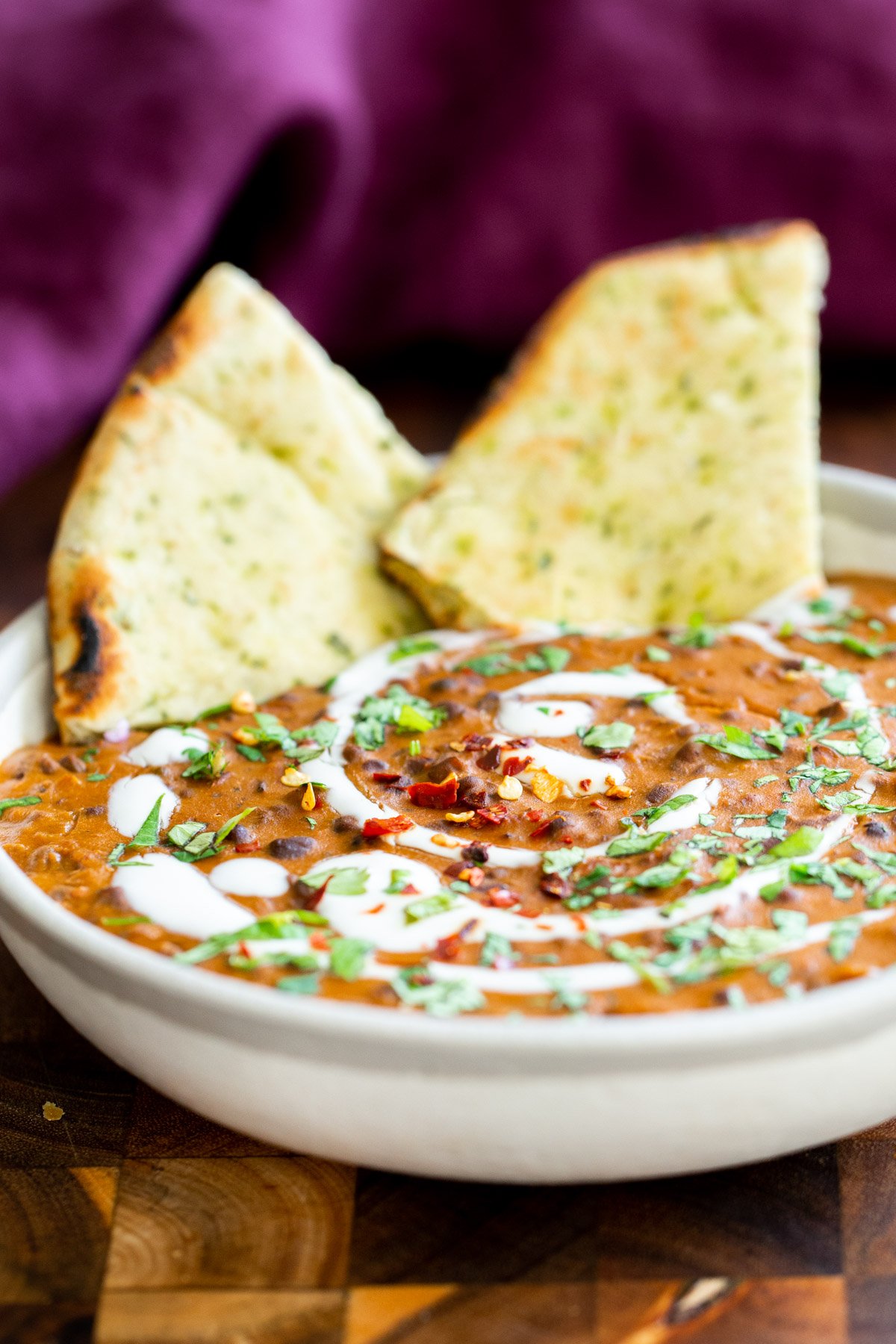 - Serve it topped with some more non-dairy cream and cilantro and pepperflakes. A dash of lemon juice also goes well with the dal. Serve with roti, Naan, flatbread (regular or glutenfree) or rice or even garlic bread.