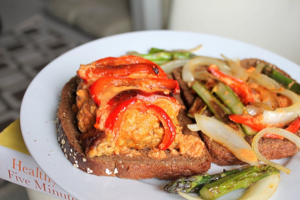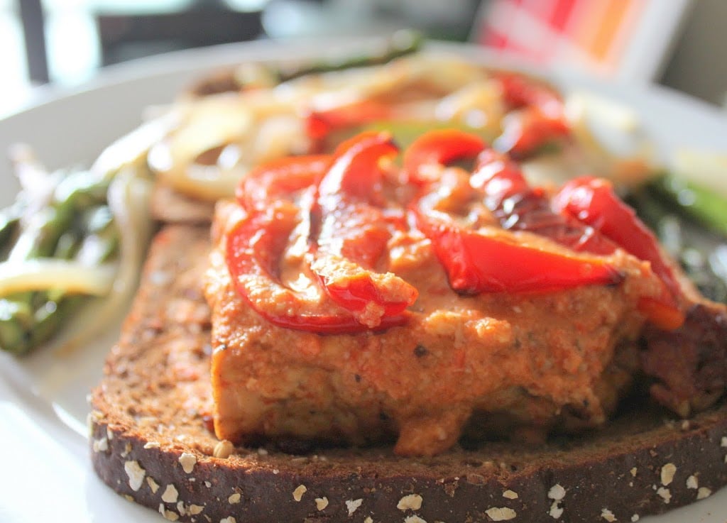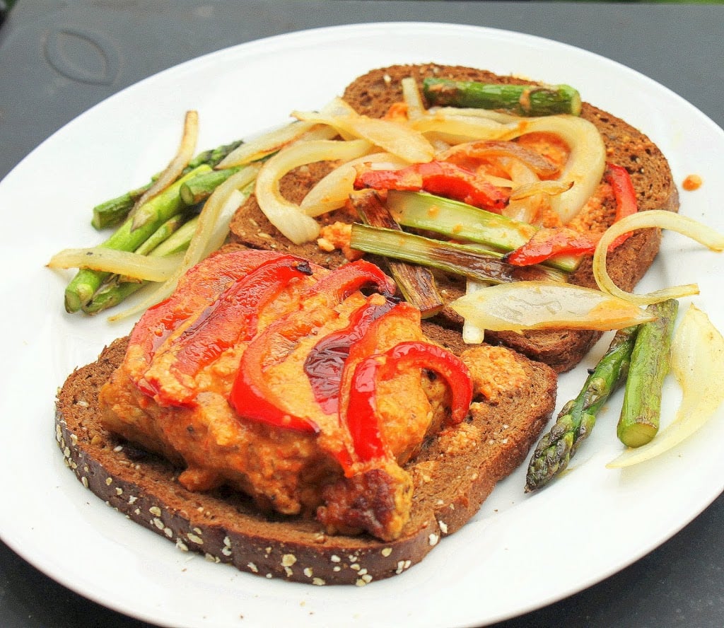 Top tempeh with the creamy Red Bell pepper Mayo, Roasted Red pepper, golden cooked onions and asparagus!!