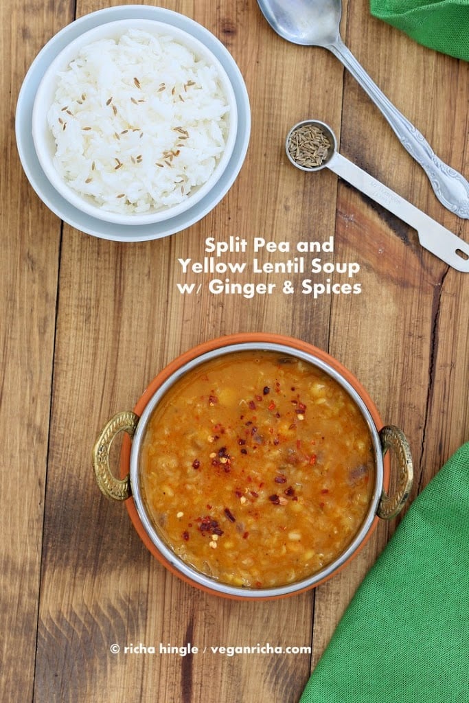 The soup usually uses chana dal, which is split chickpeas, and yellow mung dal which are available as petite yellow lentils. Chana dal can be substituted with split yellow peas.