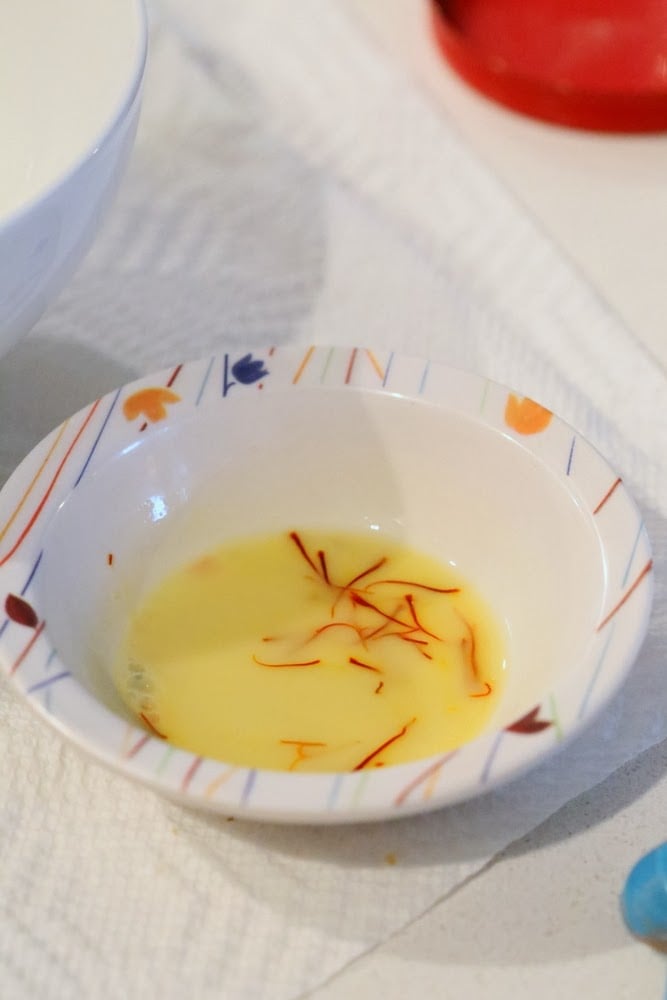 - Heat the almond milk. Mix the saffron strands in it and let sit for 5 minutes.