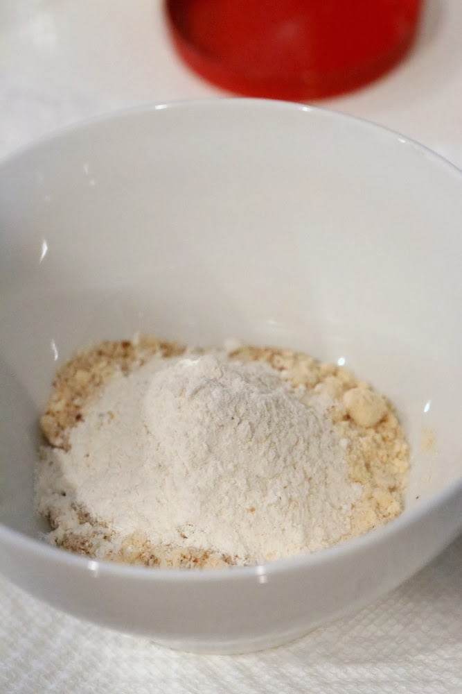 - In a bowl, mix the almond flour, coconut flour, sugar, salt and cardamom powder.