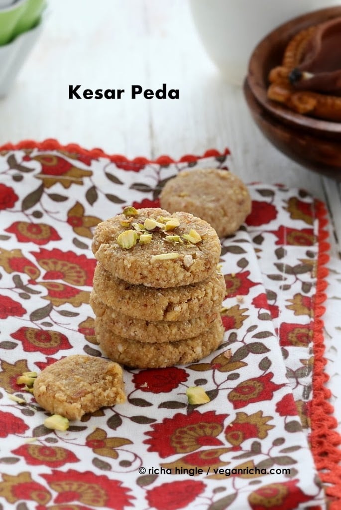 Every few weeks I try to vegan-ize Indian sweets and desserts and other dairy intense recipes which do not have a straight forward substitute or a close alternative. This past week, I had an idea about a certain texture and taste and decided to make Pedas.