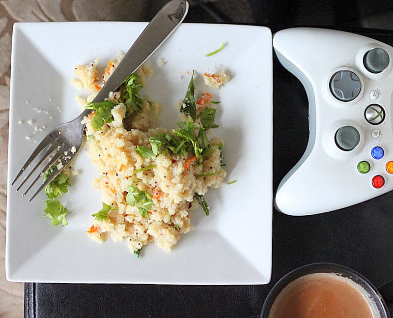 Upma- Savory Cream of wheat or rice cooked with peas, nuts and veggies