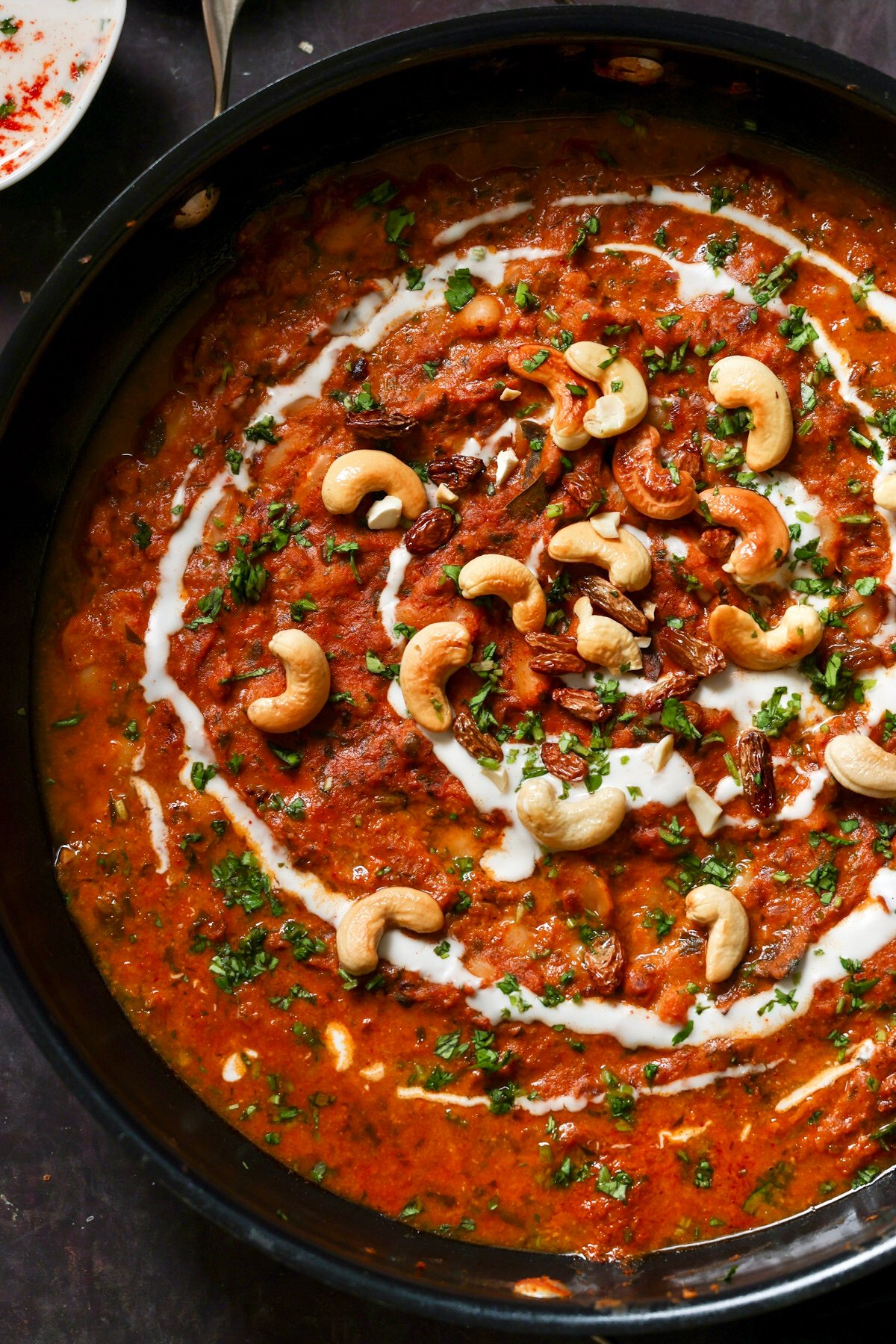 Korma is usually a meaty, stewy dish that originated in the Indian subcontinent through the Mughal Empire, which ruled that region at the time. They evolved from these decadent, meaty curries and stews made with the meat cooked with whole spices, nuts, dried fruit, and yogurt simmered over a long period to make this delicious stew, which got adapted into various Indian regional cuisines.