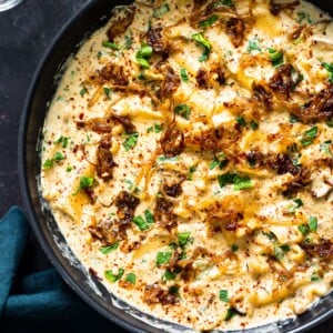 Vegan French Onion Skillet Lasagna – that’s sweet and savory caramelized onion, spinach, and vegan bechamel cooked on the stove alongside lasagna sheet pasta! No baking required! An easy one-skillet dinner your family will love!